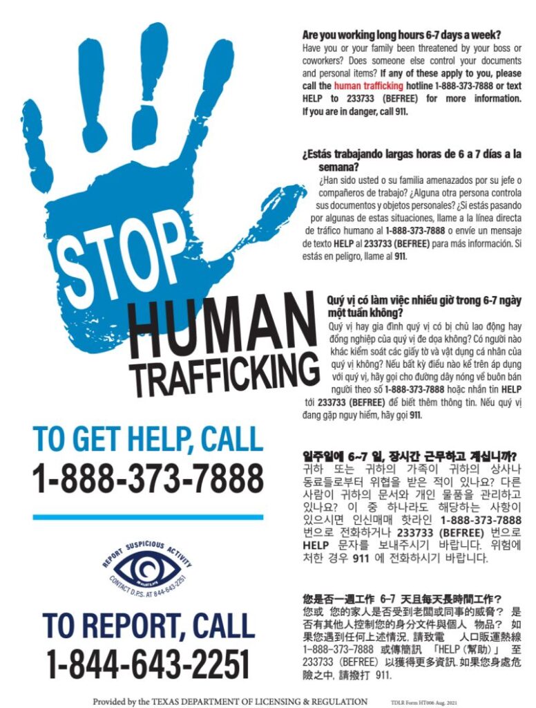 The new sign for awareness for human trafficking is displayed above, you can click on it to get a PDF of the sign directly from TDLR