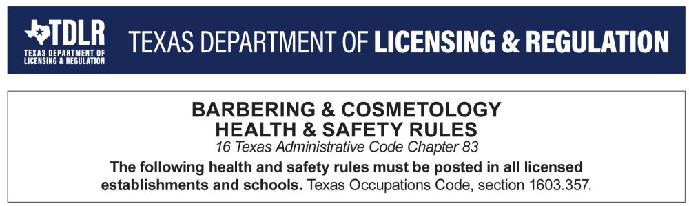 You can meet the requirement by printing the PDF linked by clicking on the image above, OR you can display the Barbering and Cosmetology Healty and Safety Rules PDF by ordering it from TDLR available by clicking HERE
